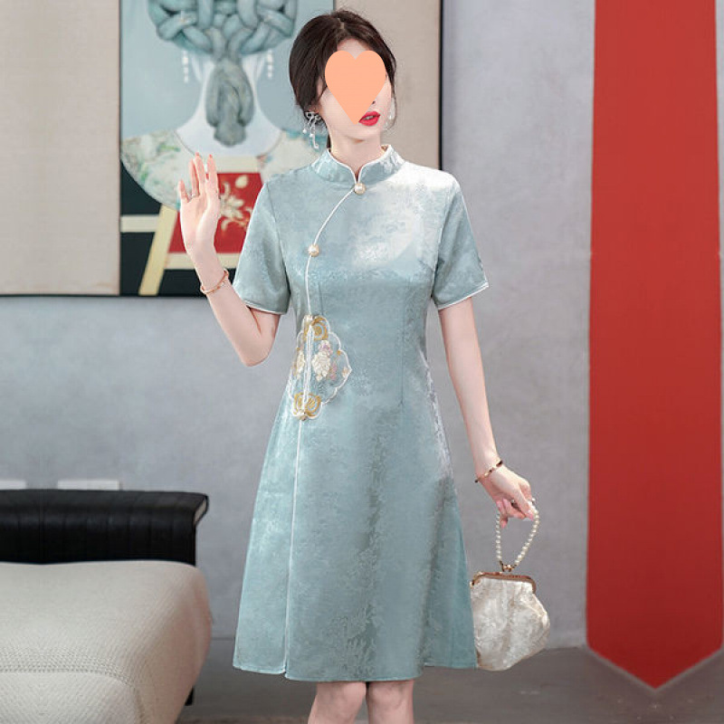 気質改良チャイナ半袖ドレス女性のための 2025 夏の新しいエレガントなレトロスリムフィットプラスサイズスカート