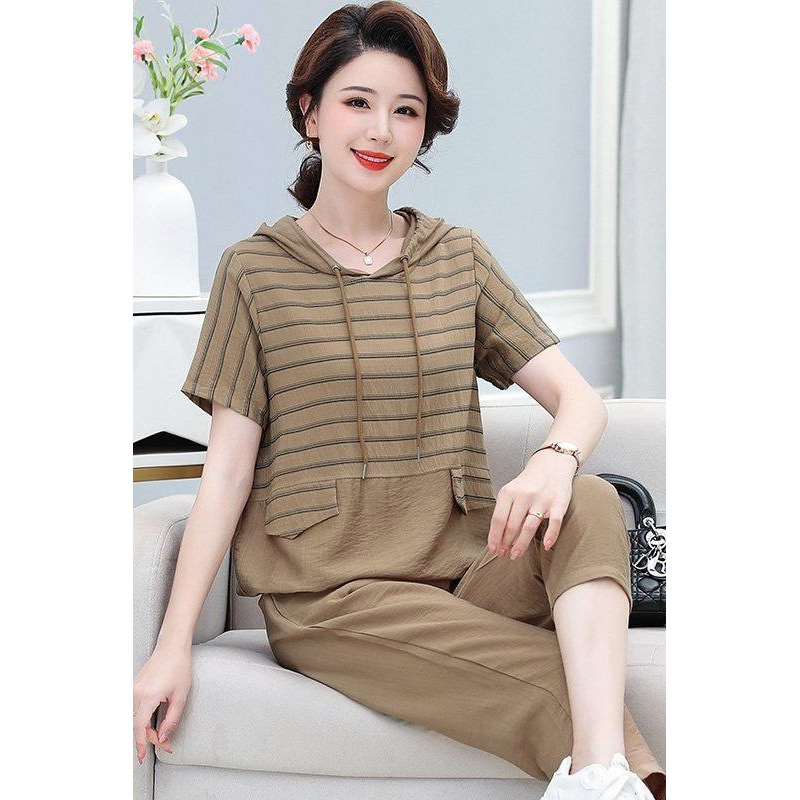 レディース夏カジュアルフード付きスーツ2025新しいスタイル中年母親半袖ファッションスポーツウェア2点セット