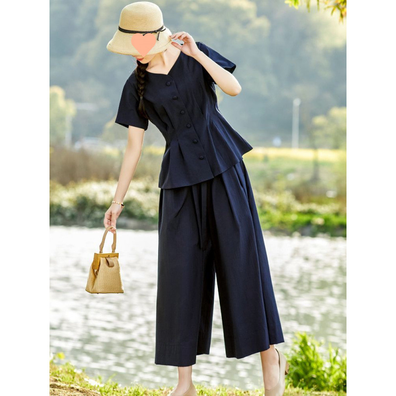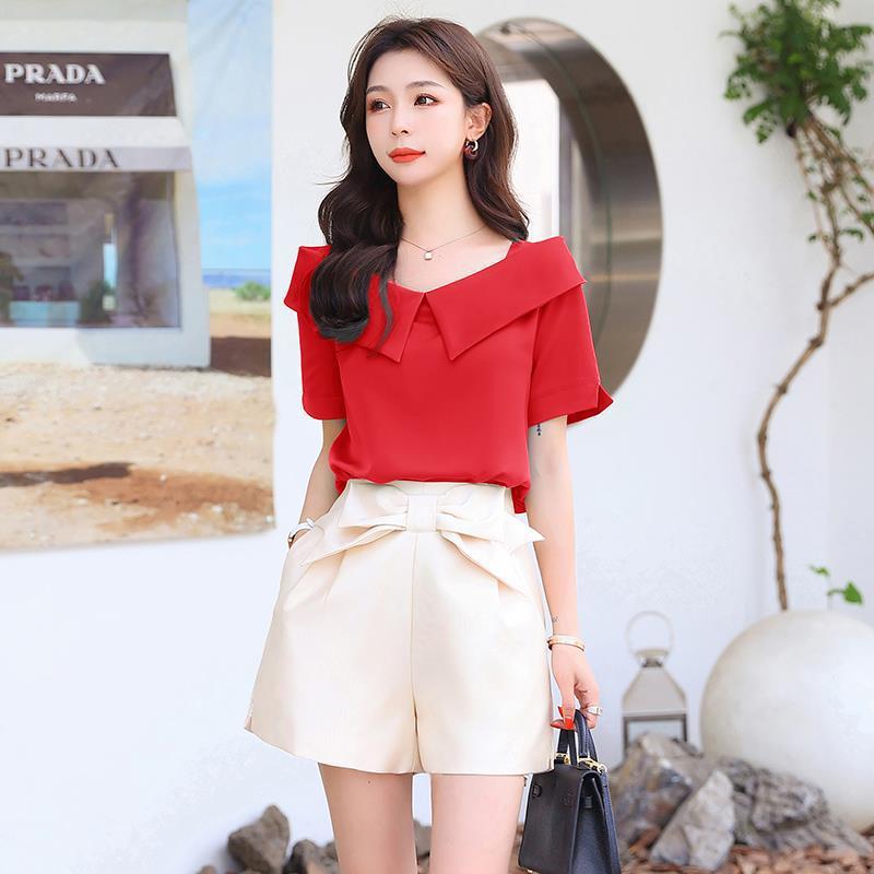 高級感とファッショナブルなツーピースショーツ夏の新しい半袖シャツリボンワイドレッグパンツ痩身スーツ