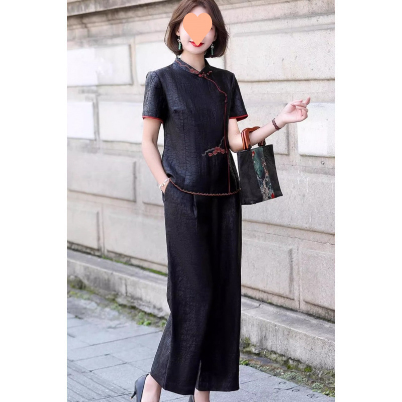 高級香雲糸スーツ女性の花シルク中国トップマザーズタートル柄ストレートパンツ新スタイル 2025 夏