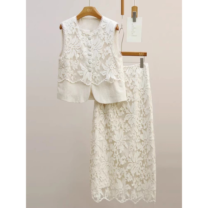2025年夏の新しい中国風ジャカードベスト、女性用のハイエンドのヘビーレーススカートスーツ
