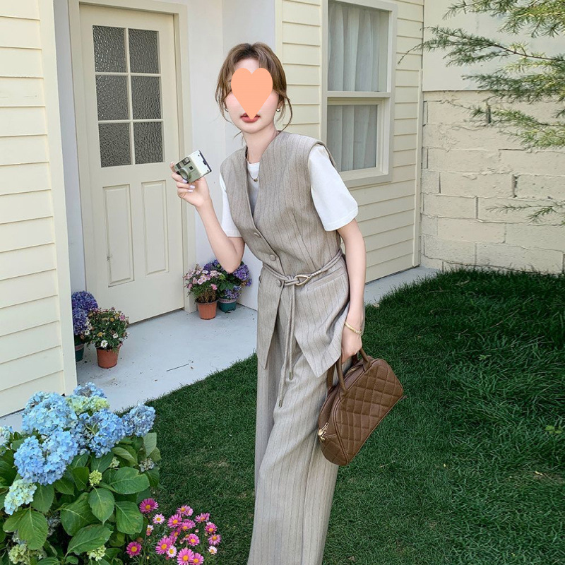 オールドマネースタイルのライトで洗練された縦縞のスーツベストスーツ女性の夏のハイエンド気質ワイドレッグパンツ2点セット