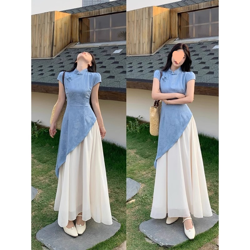 新しい中国風のブルー偽ツーピースジャカード改良されたチャイナドレス夏のユニークで美しいファッショナブルなパッチワークウエストドレス