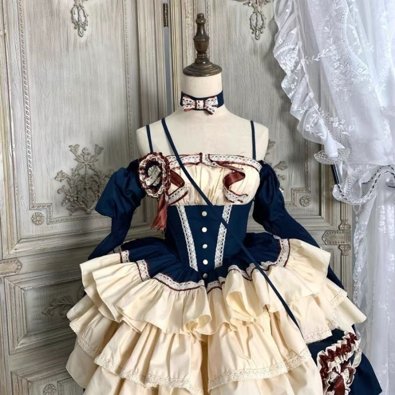 甘いロリータレトロガールコントラストカラーワンショルダーウエストケーキスカート重労働年齢軽減ファッションふわふわドレス