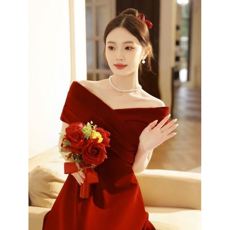 ワンショルダースタンドアップドレス2025ブライダルバーガンディ通常着用できる婚約ドレスベルベット高級雰囲気ドレス