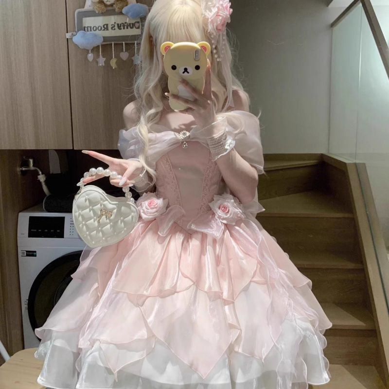 ワンショルダーピンク小花妖精ウェディングロリータ小さなイブニングドレス女性ロリータプリンセスドレスデイリードレス