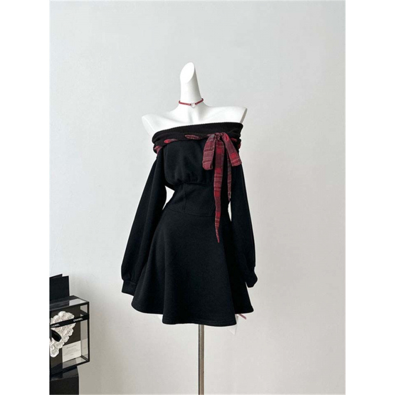 気質レディースハイエンドコントラストカラーAラインショートスカートワンショルダーチューブトップリボン超見栄えの良いドレス