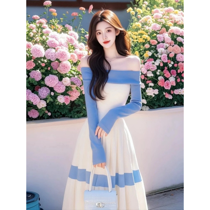 2025春超人気ブルーワンショルダードレス、リッチガール、高級感、小香風ホールスタイルスカート
