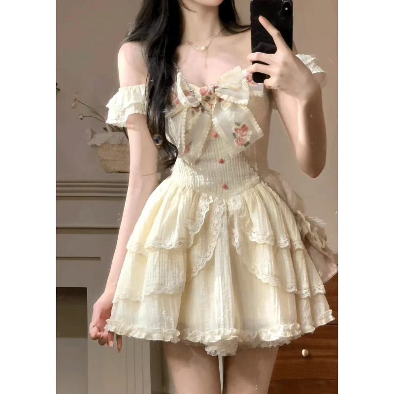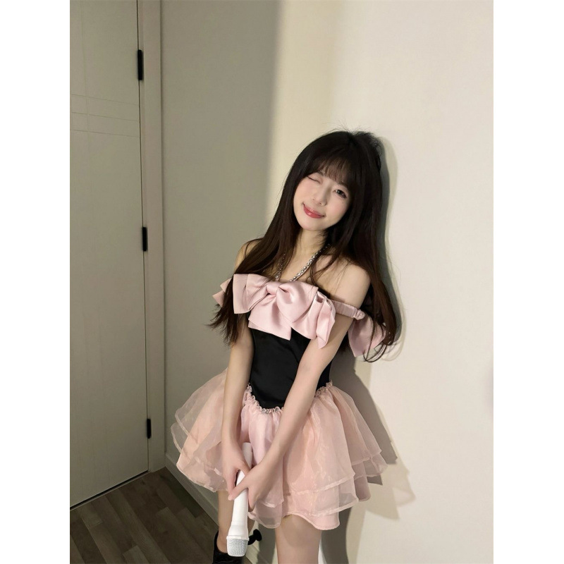 甘い純粋な欲望フライングスリーブビッグリボンプリンセスドレスワンショルダーチュチュスカート女性の夏の新しいスタイル