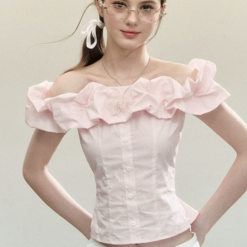 フレンチスイートワンショルダーシャツ25夏ウエスト痩身デザインショートスリムフィットオフショルダートップトレンディ