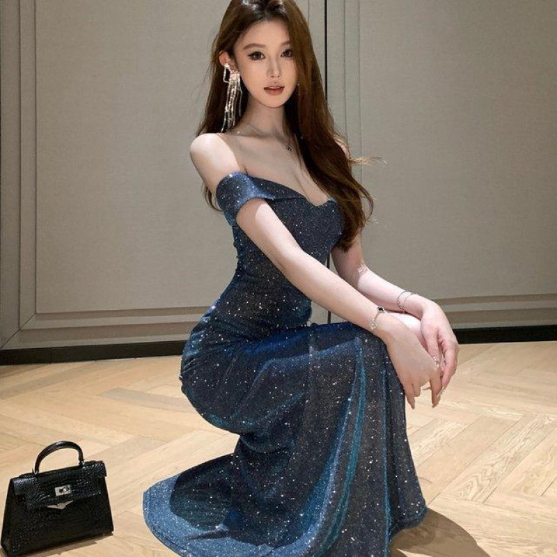 夏の新しいスタイルのハイエンドのキラキラワンショルダードレスウエストスリムフィットヒップスリットセクシードレスロングスカート女性用