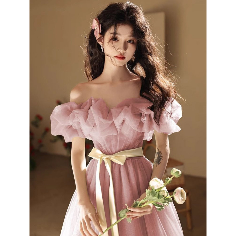 ピンクのワンショルダーイブニングドレス女性 2025 新しい宴会ハイエンドライト高級学生
