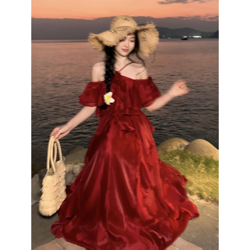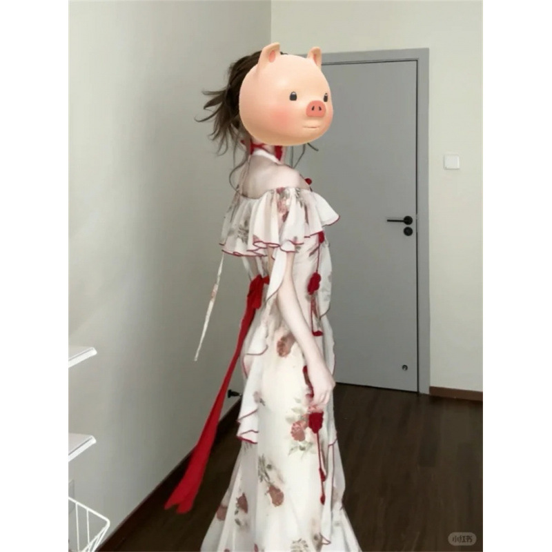 ローズクラウドレトロ明るいワンショルダーシフォンホルターネックドレス春のホットスタイルスーパーフェアリーオフショルダーロングドレス女性用