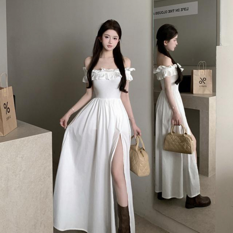 女性のためのワンショルダー黒半袖ドレス夏のフリル気質ロングスカートスリットウエスト痩身Aラインスカート
