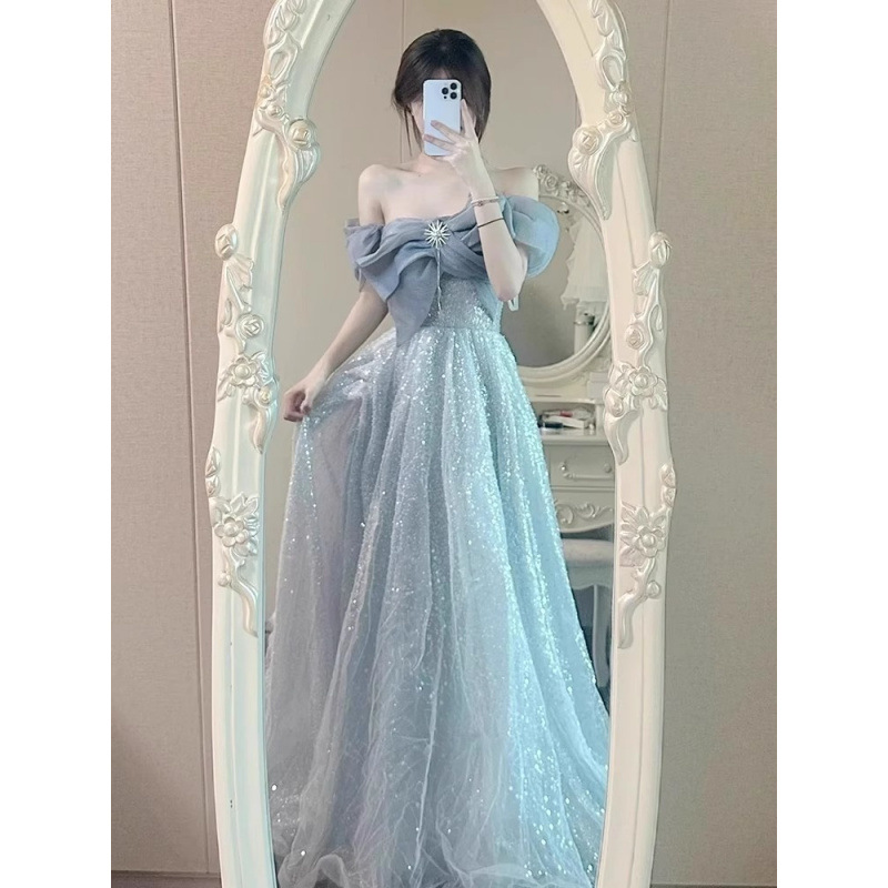 ブルー大人の誕生日宴会プリンセスドレス芸術試験ホストパフォーマンスドレスイブニングドレス女性ワンショルダーブライドメイドドレス夏