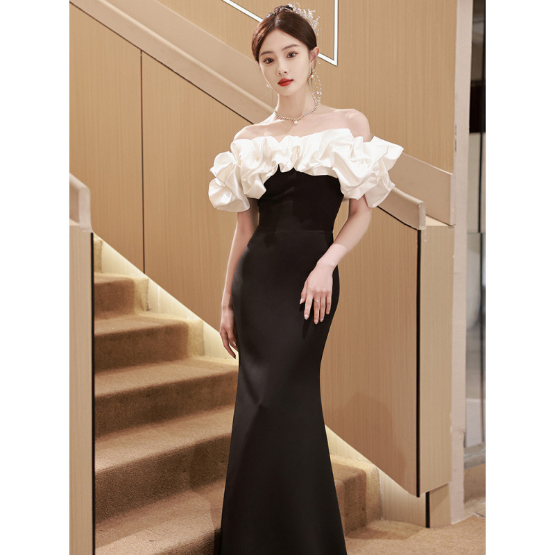 女性用ブラックハイエンドイブニングドレス、ワンショルダー、ライトラグジュアリー、ニッチセレブ気質、ホストフィッシュテールスリムドレス