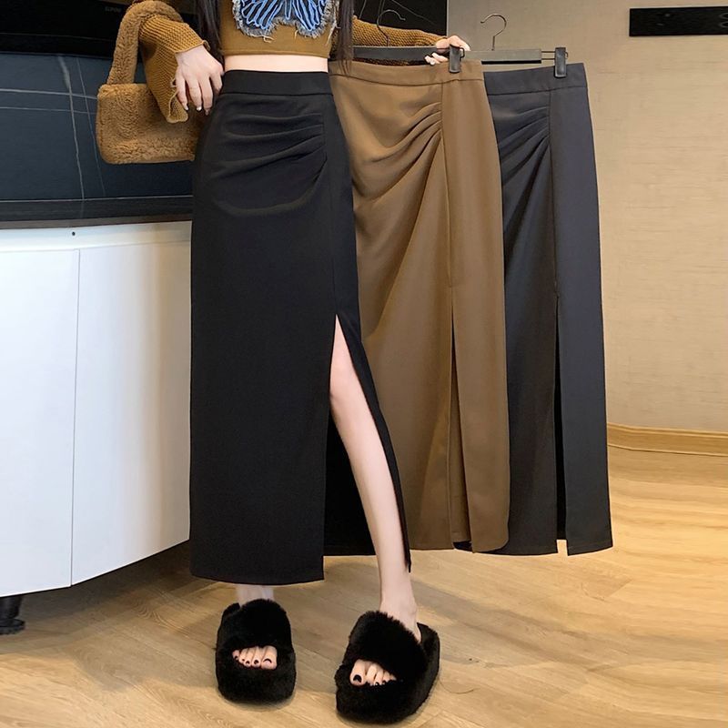 デザインスリットスカート、ハイウエスト、不規則、ミドル丈、夏痩身、新作黒、おしゃれなプリーツワンステップスカート