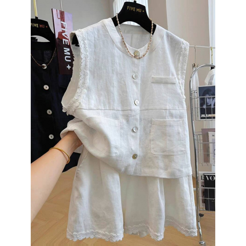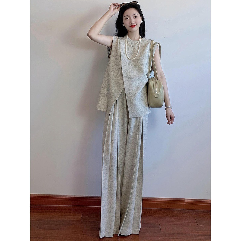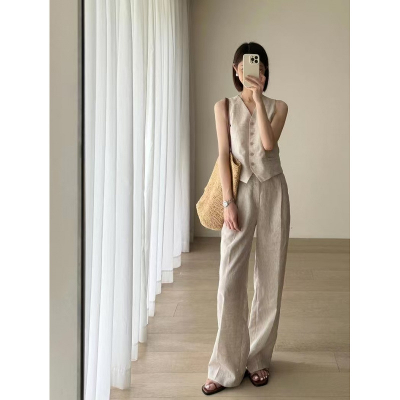 オールドマネースタイルリネンスーツ女性の夏香港スタイルレトロベストトップワイドレッグパンツハイエンドツーピースセット