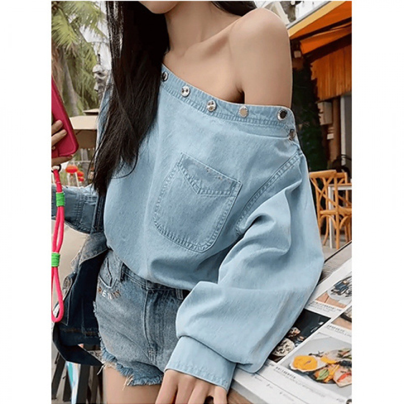 今年の早春と秋のアメリカンレトロな女性用ルーズシャツ、パーソナライズされたデザイン、ニッチな斜め肩
