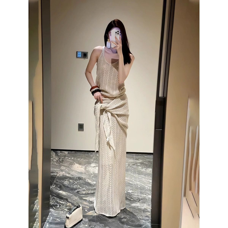 フレンチセレブスタイルニットスーツスカート女性のための夏の2025新しいノースリーブサスペンダートップヒップカバースカート3点セット