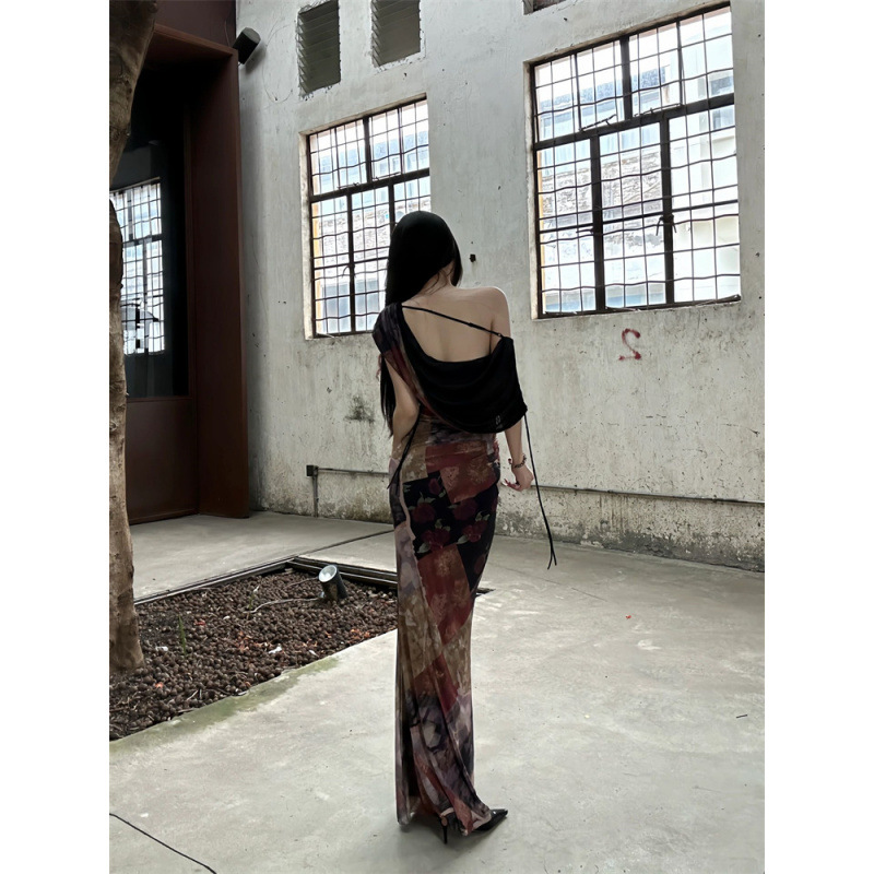 プラスサイズmmフレンチレトロデザインワンショルダープリントドレスレディース夏新作ハイエンドスリムフィットロングスカート