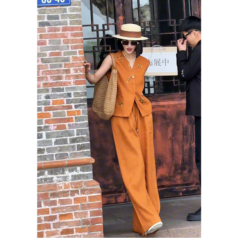 オールドマネースタイルの軽くて大人のレディースウェア、高級感のある人気の刺繍入りオレンジベストとワイドパンツの女性用ツーピーススーツ、夏用