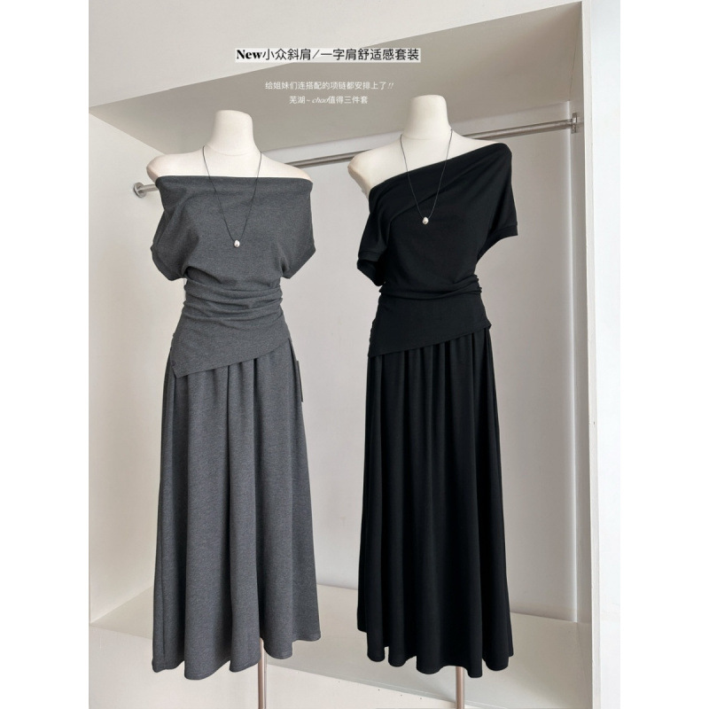 夏の韓国風高級斜め肩マルチウェアウエストトップ+ハイウエストスカートスーツ