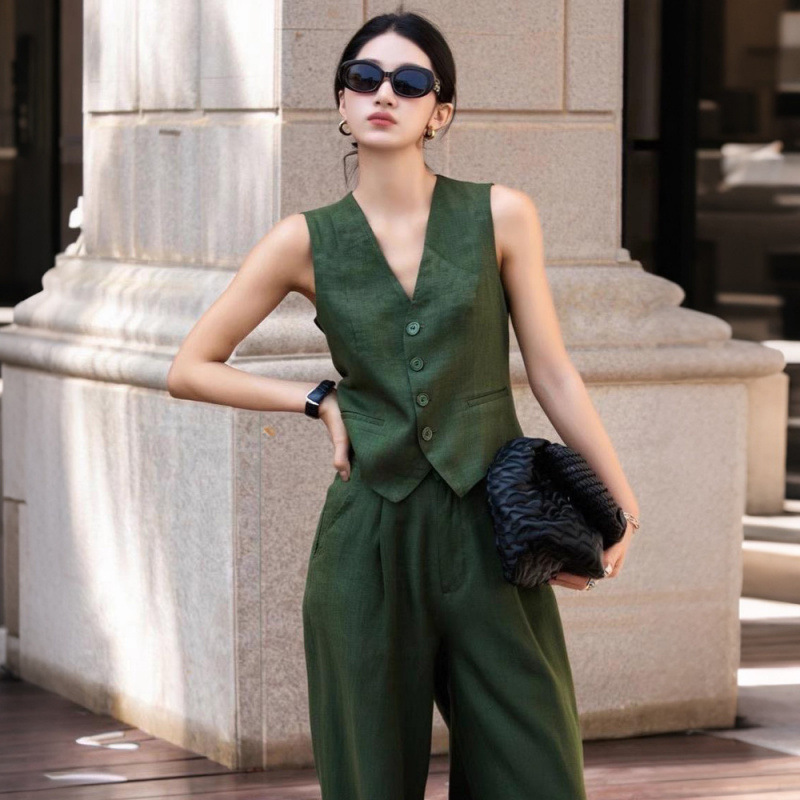 2025夏新作グリーンファッションスーツ森ガール気質休暇オールドマネースタイルベストワイドレッグパンツ2点セット