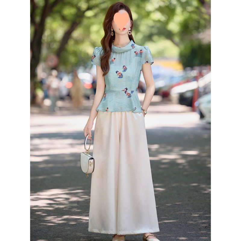 新しい中国風の女性のための夏の2025新しいスタイルのファッショナブルなウエストプリントトップワイドレッグパンツとスカートの2点セット