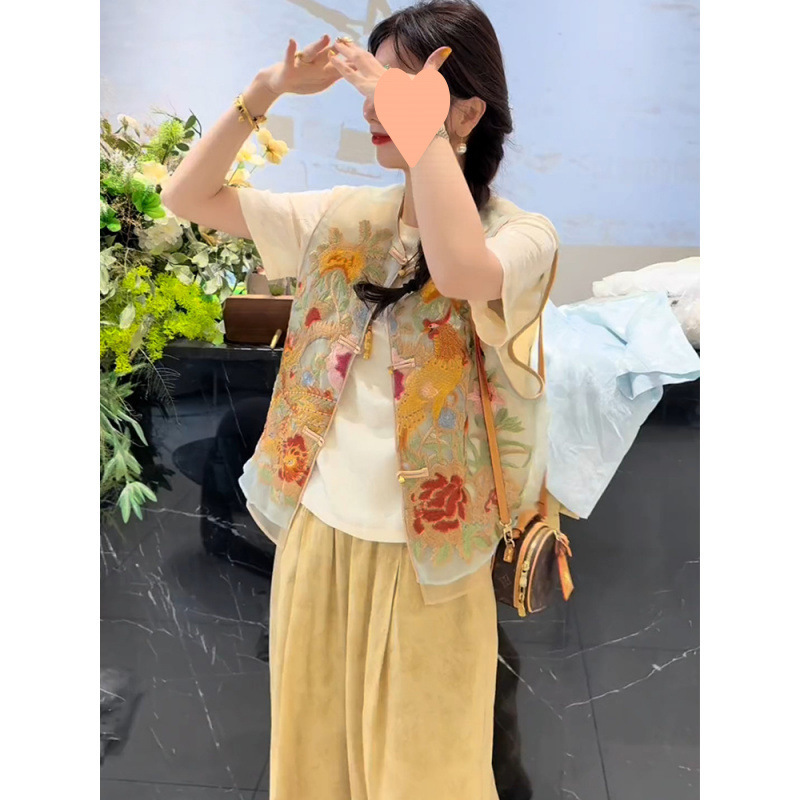 新しい中国風の女性の国民風要素刺繍ベストライト高級ハイエンドワイドレッグパンツ 3 点セット 2025 夏の新スタイル
