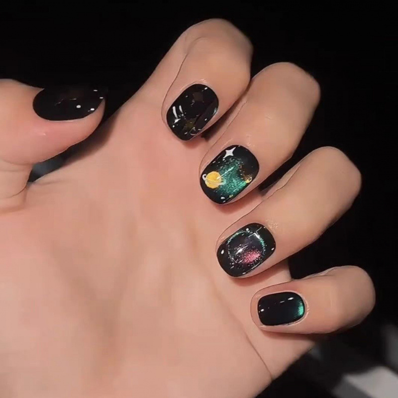 手作りブルーギャラクシーキャットアイショートハイエンドハッピープラネットスイートクールホワイトネイルパッチ学生マニキュア