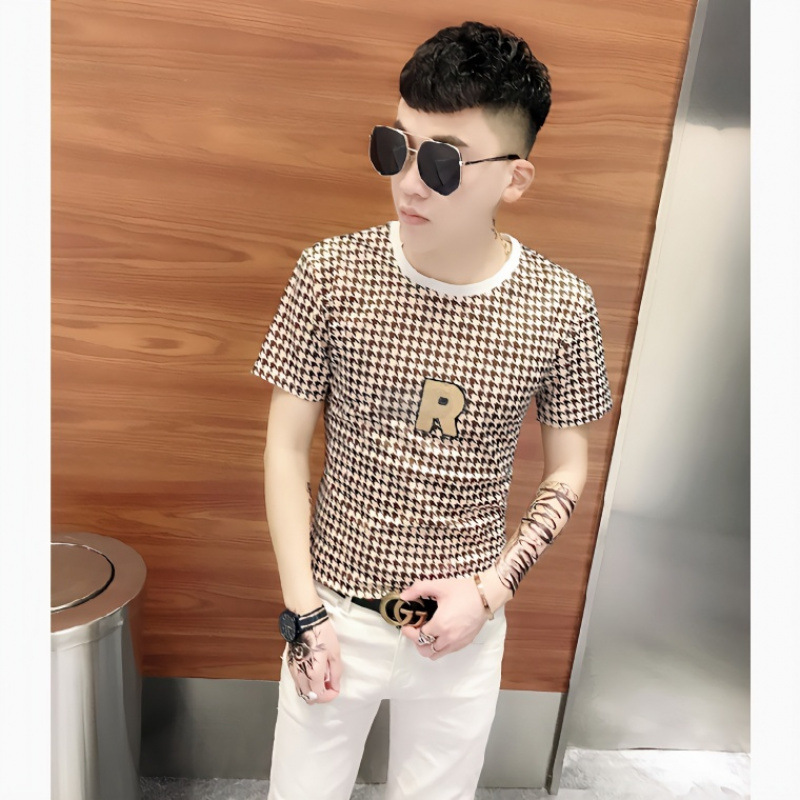 2025 夏の新韓国スタイル千鳥格子刺繍半袖 Tシャツメンズファッショントレンドハンサムな個性半袖トレンディな T