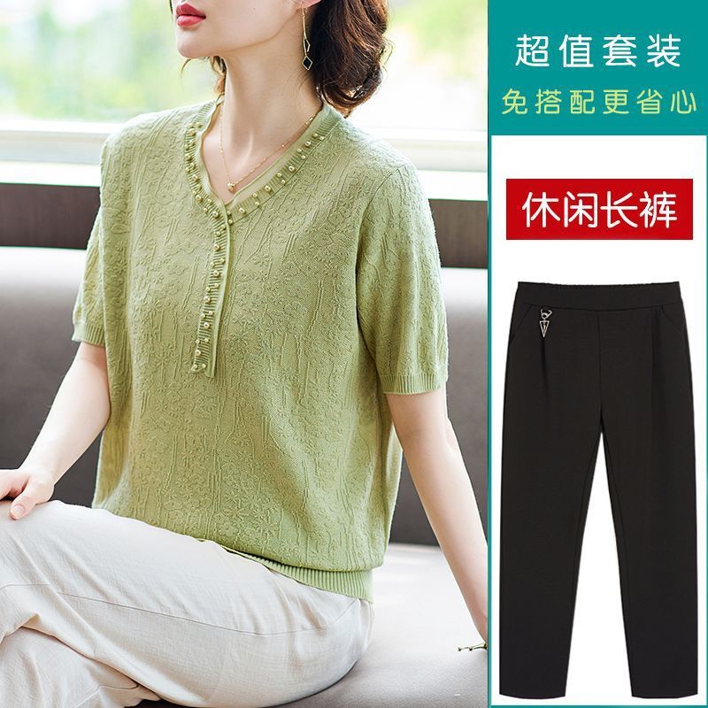 ママの夏服アイスシルク半袖Tシャツおしゃれ2024新作中高年女性夏トップスツーピーススーツ