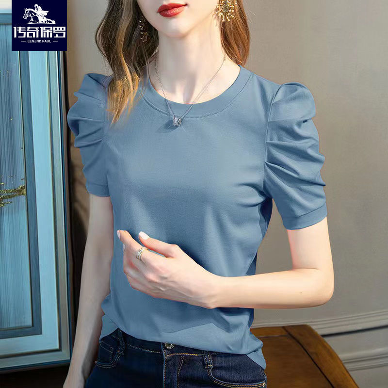 女性のための半袖 T シャツ夏 2023 新しい夏のレトロな宮殿プリーツパフスリーブデザインニッチコットントップ
