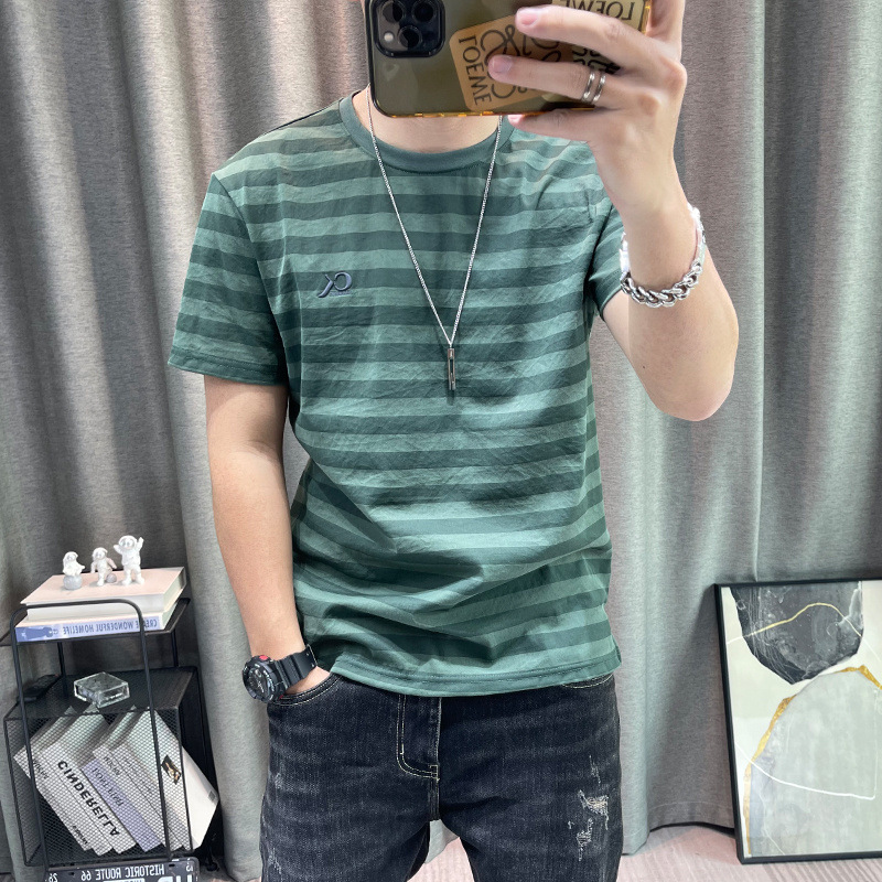 ストライプ半袖 Tシャツメンズ 2025 夏の新メンズアイスシルクコットン半袖 Tシャツハイエンド紳士服