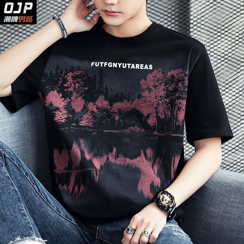 夏半袖Tシャツメンズ韓国風ルーズデニム五分袖トップス若い学生カジュアルラウンドネックTシャツ
