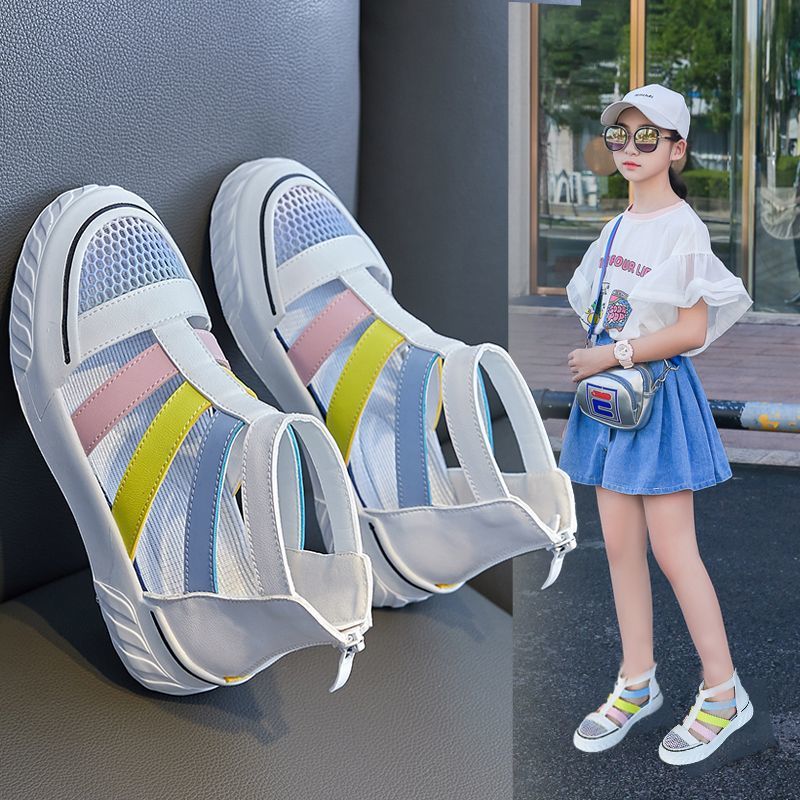 女の子サンダル本革女の子プリンセスシューズ 2025 新しい子供の夏通気性メッシュシューズソフトソール包頭スポーツシューズ