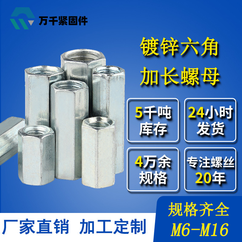 炭素鋼亜鉛メッキ六角長ナットジョイントナット、長く厚くした六角ナット、ネジ、防錆、緩み止め
