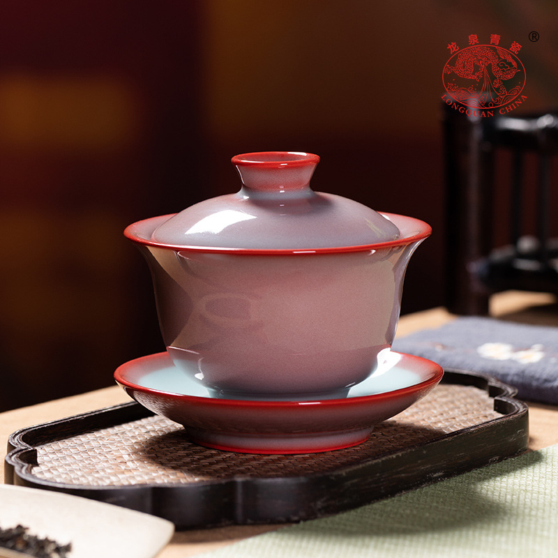 竜泉青磁の三才蓋碗の大きいサイズの手作りの赤い釉薬はお茶を入れます。