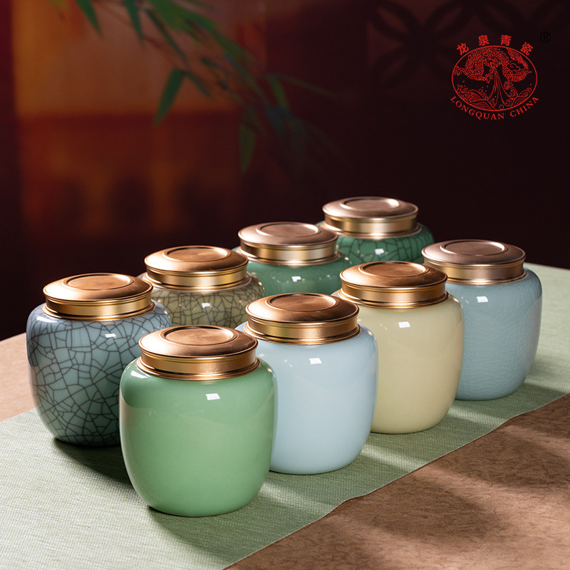 竜泉青磁大サイズ茶葉缶金属蓋防湿密封缶陶磁器半斤入り手作り茶缶貯蔵タンク