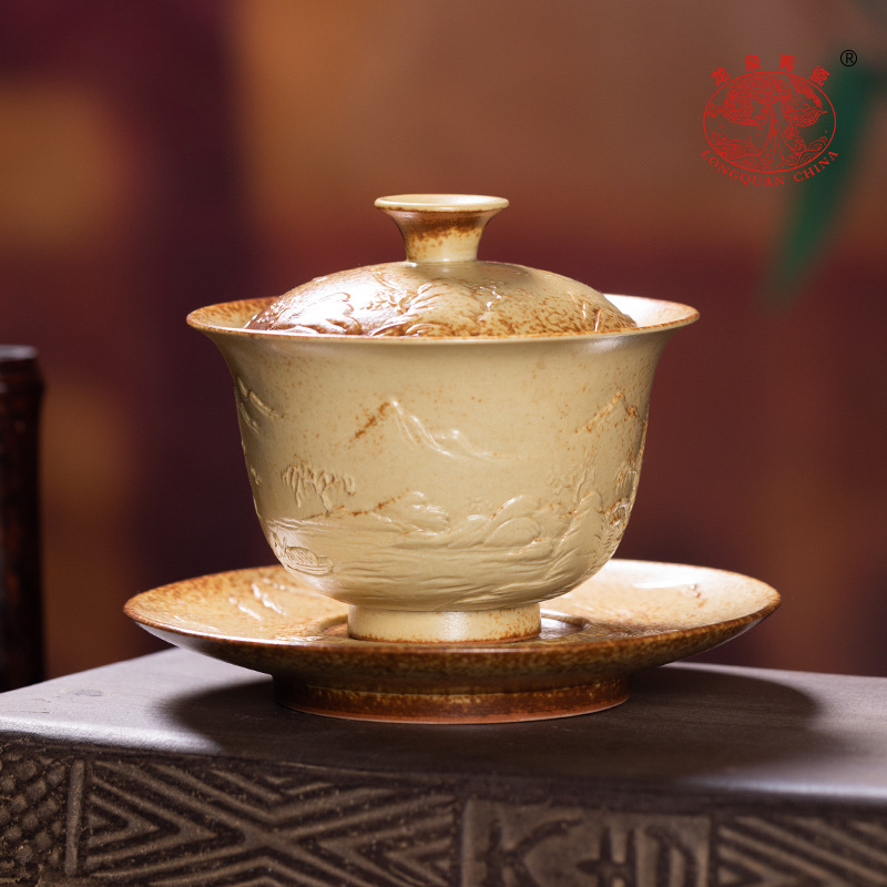 竜泉青磁の創意手作り柴焼山水蓋碗陶磁器の工夫三才蓋碗敬茶手はお茶を入れます。
