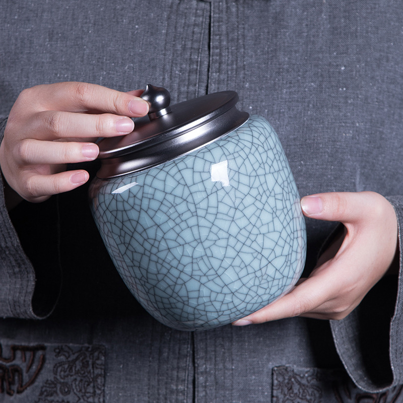 竜泉青磁密封茶缶大容量保存茶缶陶磁器大サイズ金属蓋防湿貯蔵茶缶