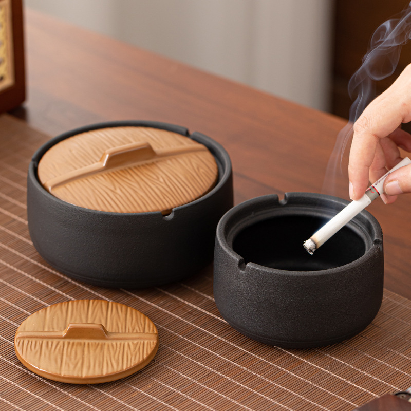 冬未レトロ粗陶灰皿陶磁器蓋付き飛灰防止家庭用リビングテーブル大灰皿