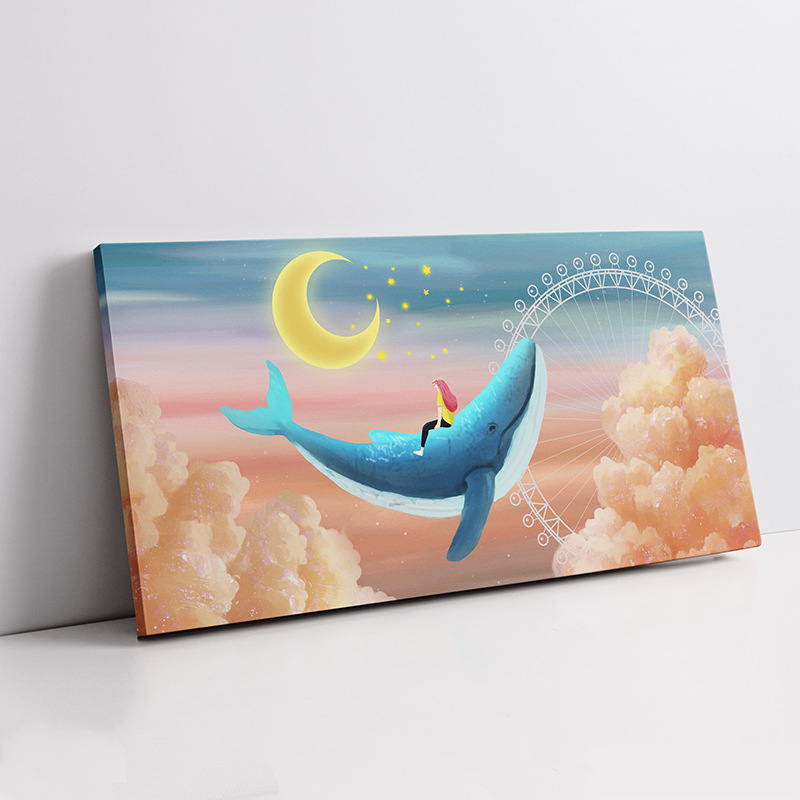 現代のシンプルな子供の部屋の装飾画の小清新な癒し系のアニメの海のクジラの女の子の雲の横の版は絵を掛けます。
