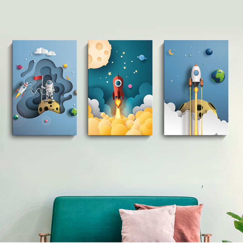 現代のシンプルな子供の部屋の装飾画宇宙飛行士星空月宇宙星寝室のベッドの背景壁の壁画