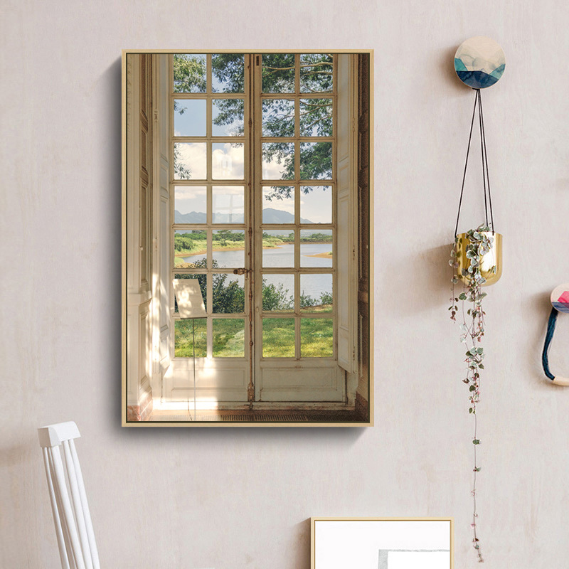 現代のシンプルなリビングルームの装飾画のフランス式の窓の暖かい風景の窓の外の小さい清新なレストランの寝室の民宿は絵を掛けます。
