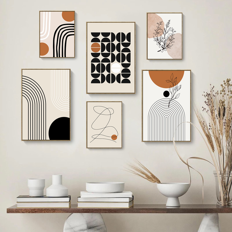 シンプルな北欧の抽象的な幾何学の白黒の線のモランディオレンジ色の芸術の組み合わせの装飾画の客間のレストランは絵を掛けます。