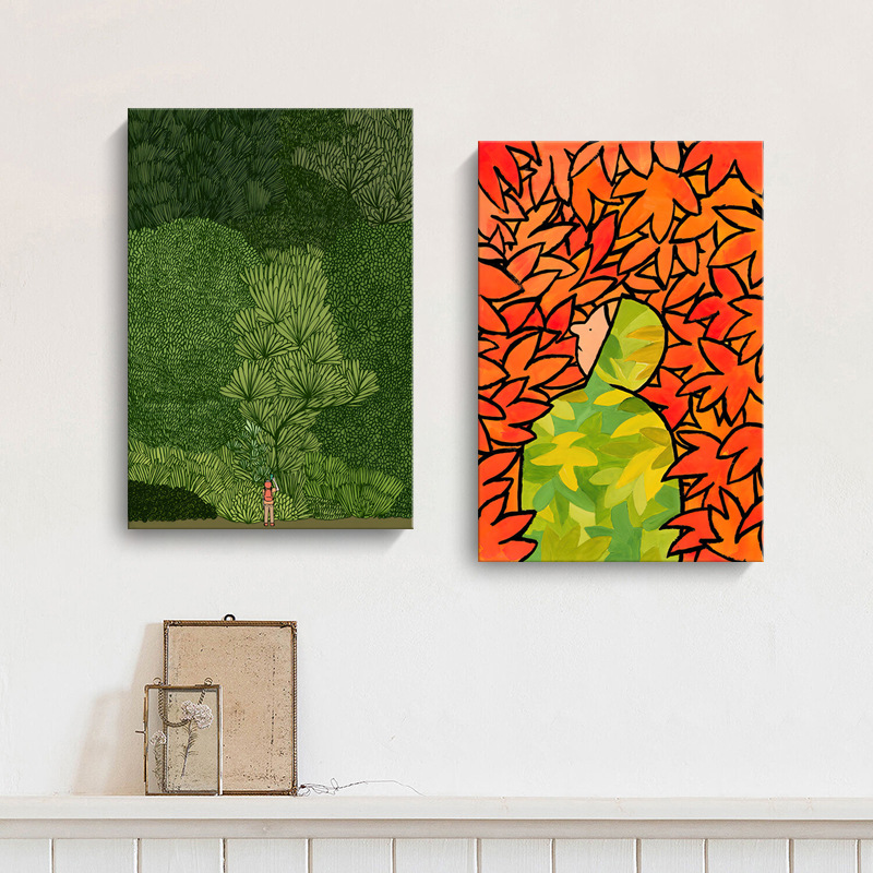 アメリカのレトロなリビングルームの装飾画緑の森の赤いカエデの葉の小さい大衆は北欧の芸術を掛けて絵を掛けます。