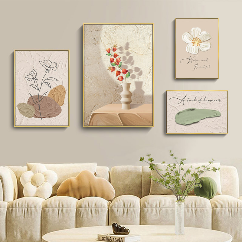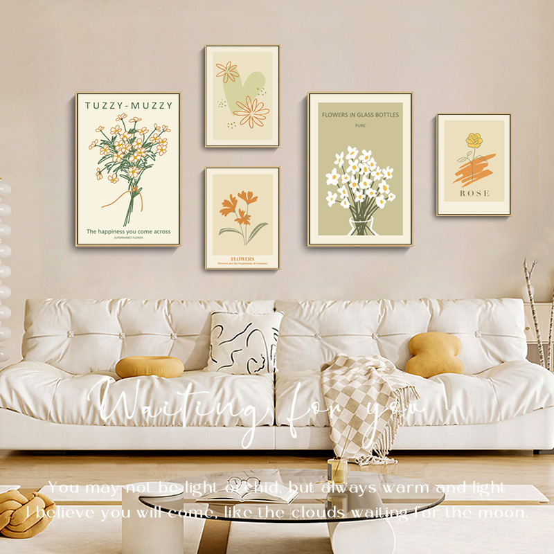 北欧シンプルなリビングルーム装飾画insクリーム風小清新花卉小菊モランディ色民宿掛け画