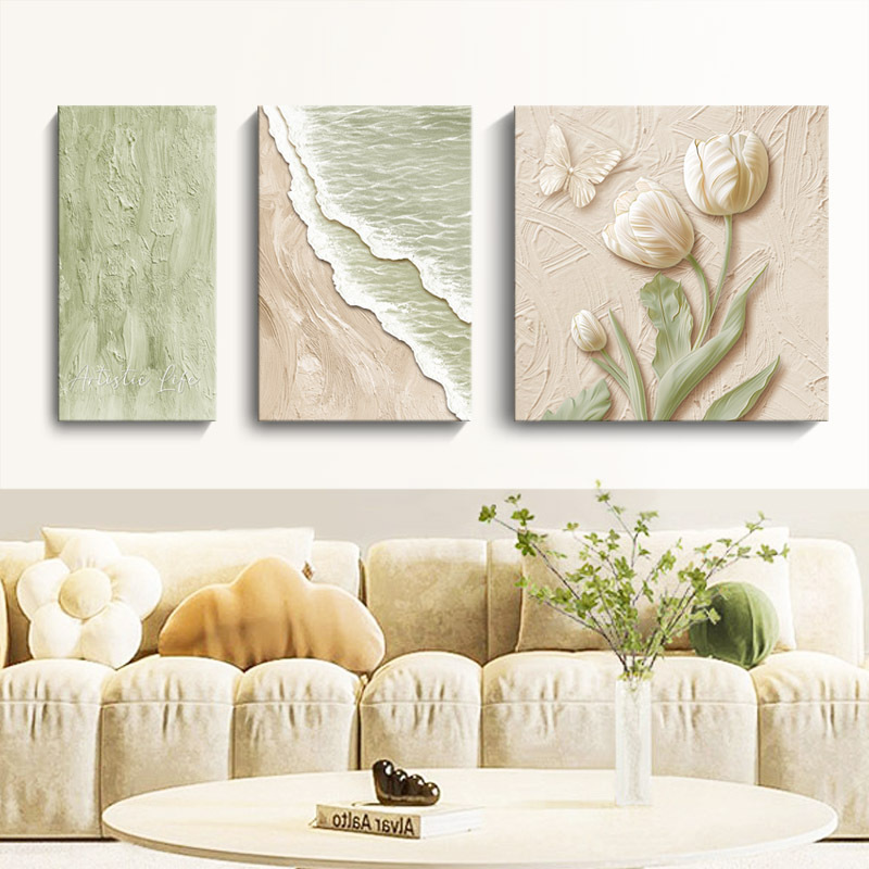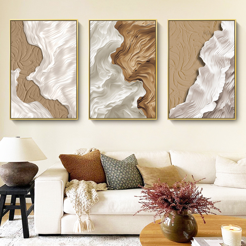 クリーム風北欧筋理油絵癒し系風景芸術感三連客間ソファー背景壁装飾画